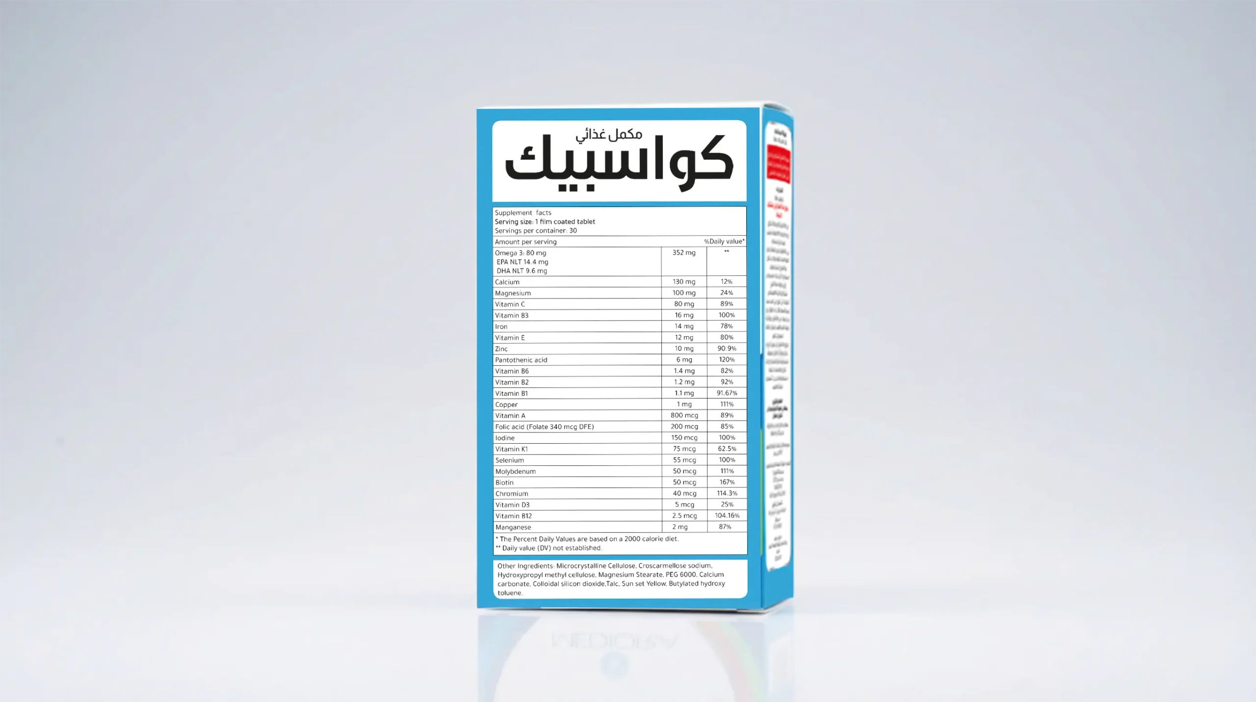فيتامينات عالية الجودة ومعادن كاملة الطيف مع أوميجا-3 دعم يومي شامل في منتج واحد: يجمع كواسبيك بين فيتامينات متعددة كاملة، معادن أساسية، وأوميجا-3 عالية الجودة (EPA & DHA) في قرص واحد سهل البلع. مصمم لأسلوب حياة حديث، فهو يدعم الصحة العامة، الطاقة اليومية، استشفاء العضلات، والحيوية، مما يجعله المكمل اليومي الوحيد الذي تحتاجه لدعم غذائي كامل. مصمم علميًا: يوفر كواسبيك 24 فيتامينًا ومعادن أساسية، متوازنة بعناية لدعم الأيض، وظائف الجهاز المناعي، الحماية المضادة للأكسدة، صحة القلب والدماغ، تكوين كريات الدم الحمراء، والوظائف الطبيعية للجهاز العصبي، وصحة العضلات مما يوفر دعمًا غذائيًا شاملًا مستندًا إلى الأدلة العلمية.